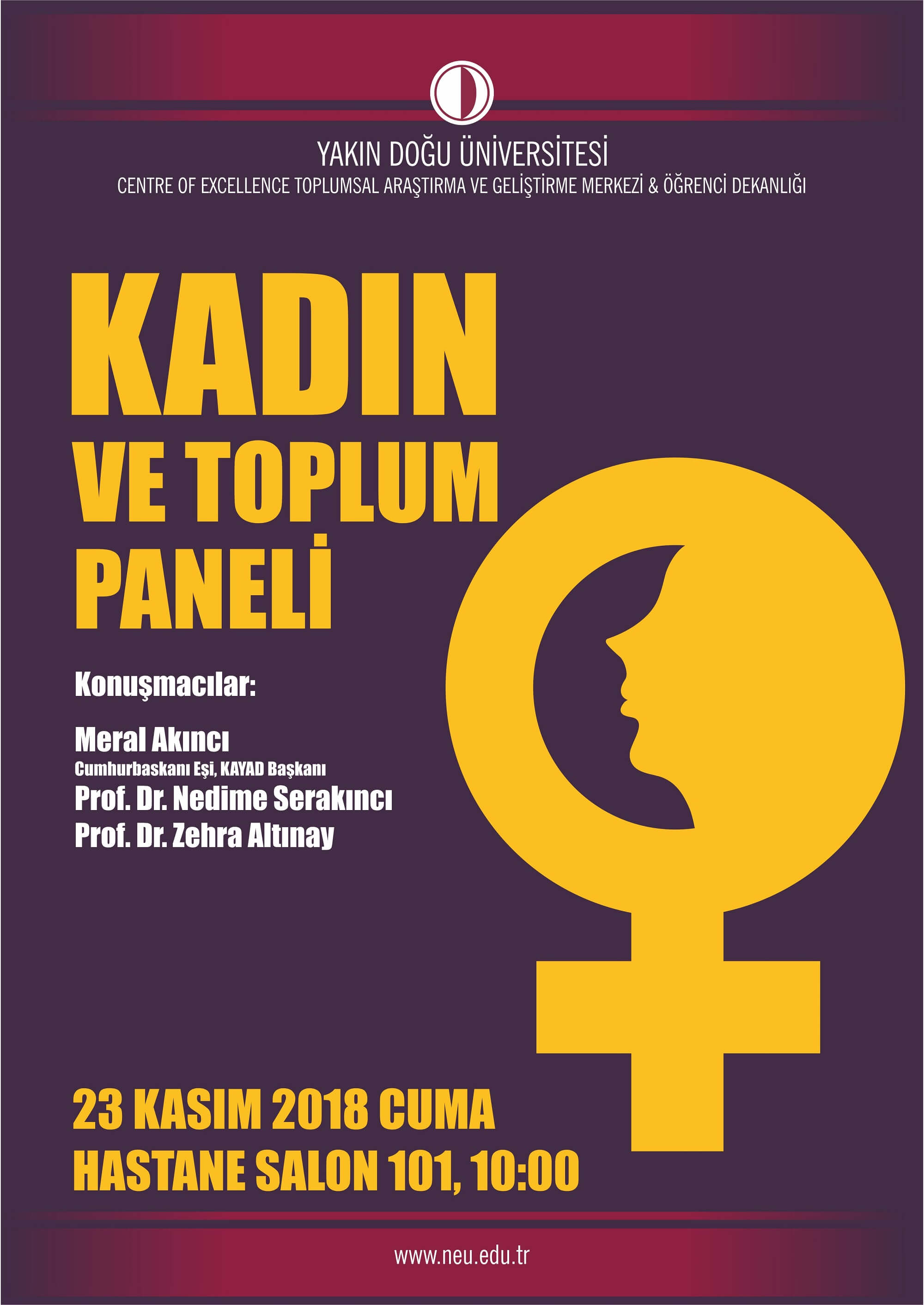 Sayın Meral Akıncı (Cumhurbaşkanı Eşi, KAYAD Başkanı), Prof. Dr. Nedime Serakıncı ve Prof. Dr. Zehra Altınay’ın panelist olacağı panel de tüm öğretim elemanı ve öğrencilerimizi aramızda görmekten mutluluk duyarız.